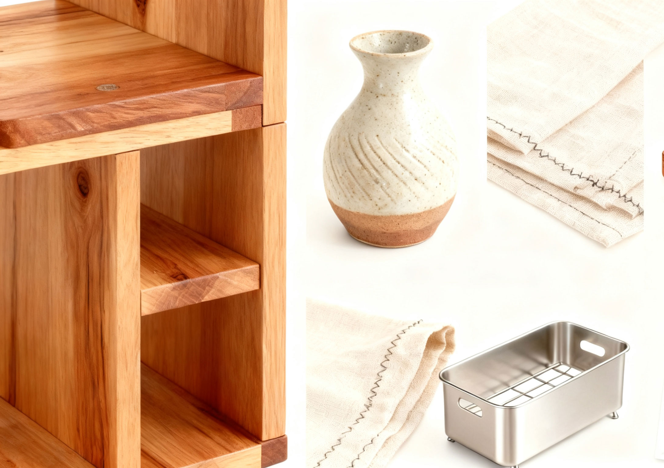 こうした「空間の悩み」に対応するため、当社の収納シリーズはモジュール式で折りたたみ可能なデザインを採用しています。多層収納ボックスは、水平に組み立ててローキャビネットにしたり、垂直に積み重ねてニッチに埋め込んだりすることができ、京都の町家の細長い間取りや東京のマンションの狭い隅にも完璧にフィットします。折りたたみ棚は、広げて本や装飾品を収納し、折りたたむと紙のように薄くなり、最小限のスペースしか占有しません。壁掛け収納バッグは、衣類、文房具、食器などを収納できる階層型設計を採用し、壁に穴を開ける必要がなく、設置時に壁を傷つける心配もありません。狭いマンションの空間活用ロジックにぴったりです。「気候特性」を考慮し、製品は全面的に最適化されています。無垢材家具の表面には天然の蜜蝋コーティングが施されており、防湿性と耐ひび割れ性に優れ、梅雨でも温かみのある風合いを保ちます。綿麻生地には抗菌・防カビ加工が施されており、長期保管しても臭いの発生を防ぎます。陶器製品は底部に排水穴を設け、水が溜まりにくくカビの発生も防ぎ、観葉植物を飾る日本の家庭の習慣にも応えています。 「侘び寂び」の美意識を貫き、天然木の色、オフホワイト、ライトグレーを基調に、地元産の杉材、オーガニックコットンやオーガニックリネン、佐賀の土など、素材本来の風合いや微妙な凹凸を大切にした製品に仕上げています。京都の枯山水のように、シンプルさの中に奥深い魅力を秘めています。